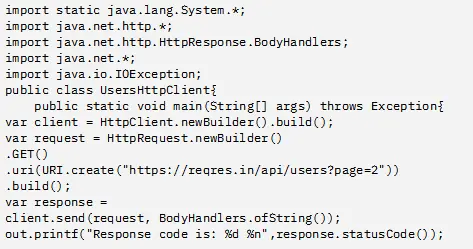 让我们看一下使用JDK 11随附的新HTTP客户端API进行HTTP调用的代码。这些API是JavaSE9中的孵化器功能,但已逐步引入该java.net.http模块。