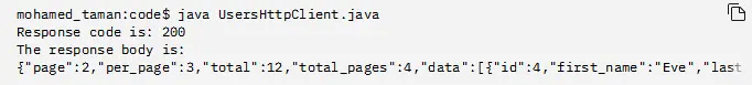 在此示例中,我将调用一个简单的REST API GET方法来通过调用端点服务来获取一些用户https://reqres.in/api/users?page=2。示例代码位于名称为的文件中UsersHttpClient.java: