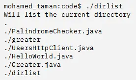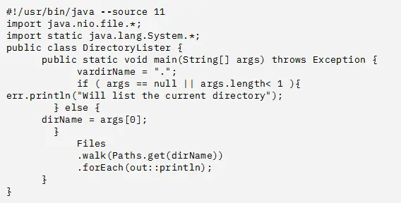 注意,在评估源代码时,解释器会忽略shebang行(第一行)。shebang文件也可以由启动程序显式调用,也许还有其他选项,例如:$ java -Dtrace=true --source 11 dirlist。 另外,如果脚本文件在当前目录中,则可以这样执行:
