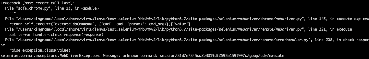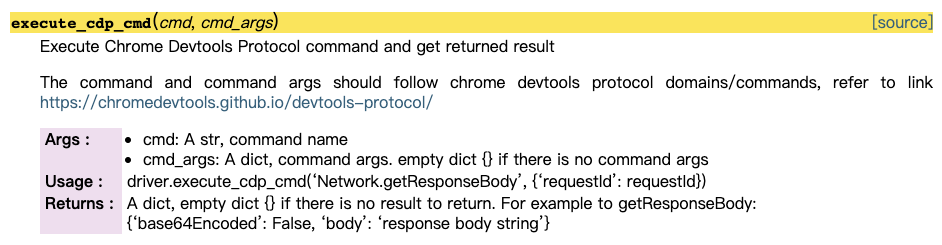 那么如何在 Selenium 中调用 CDP 的命令呢?实际上非常简单,我们使用driver.execute_cdp_cmd。根据 Selenium 的官方文档,传入需要调用的 CDP 命令和参数即可: