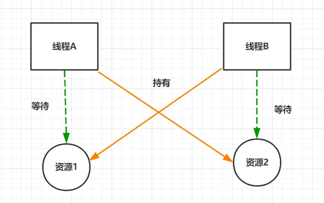 就如上图,线程A持有资源2,同时想申请资源1,线程B持有资源1,同时想申请资源2,两个线程相互等待就形成了死锁状态。