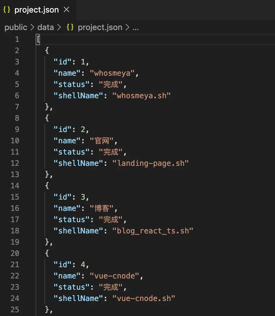 项目id,项目名称,项目状态,项目指定shell脚本名称。 简单部署系统,所以采用读写json文件,也可以使用mysql, mongoDB等数据库。