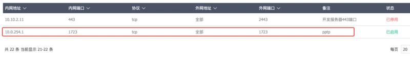 为了让我们的 VPN 服务向互联网中提供服务,我们还需要在路由器中将互联网地址的 pptpd 服务端口映射到这台局域网的 VPN 服务器中,pptpd 默认采用的端口是 1723,在笔者的网络环境中 VPN 服务器的局域网IP地址为 10.0.254.1,所以我需要将互联网的 1723 端口映射到 10.0.254.1 的 1723 端口,如图: