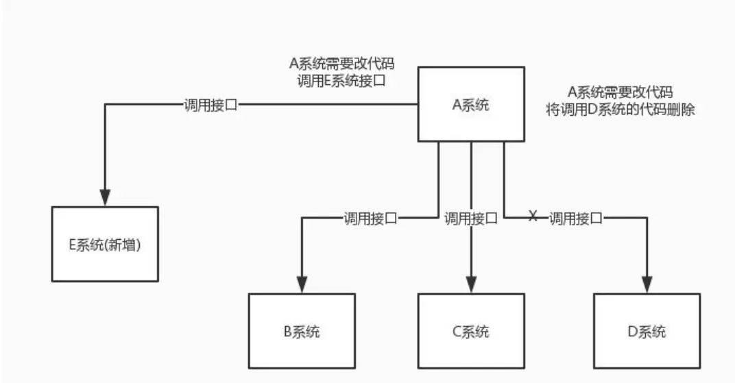 看这么个场景。A 系统发送数据到 BCD 三个系统,通过接口调用发送。如果 E 系统也要这个数据呢?那如果 C 系统现在不需要了呢?A 系统负责人几乎崩溃......