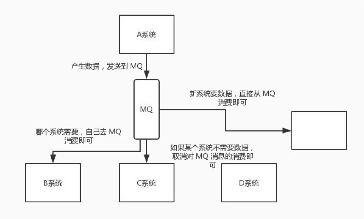 如果使用 MQ,A 系统产生一条数据,发送到 MQ 里面去,哪个系统需要数据自己去 MQ 里面消费。如果新系统需要数据,直接从 MQ 里消费即可;如果某个系统不需要这条数据了,就取消对 MQ 消息的消费即可。这样下来,A 系统压根儿不需要去考虑要给谁发送数据,不需要维护这个代码,也不需要考虑人家是否调用成功、失败超时等情况。