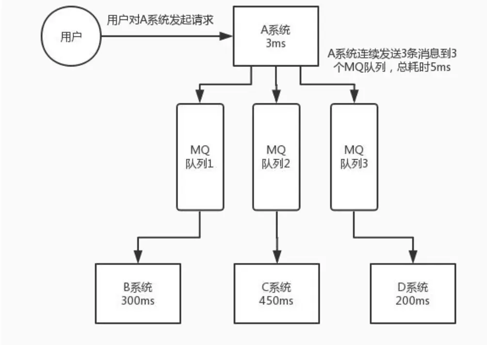 如果使用 MQ,那么 A 系统连续发送 3 条消息到 MQ 队列中,假如耗时 5ms,A 系统从接受一个请求到返回响应给用户,总时长是 3 + 5 = 8ms,对于用户而言,其实感觉上就是点个按钮,8ms 以后就直接返回了,爽!网站做得真好,真快!