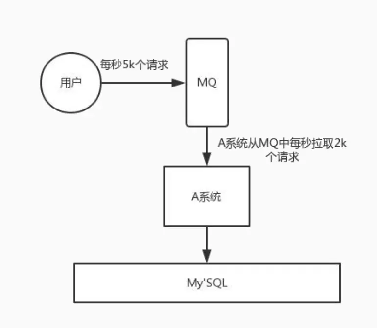 如果使用 MQ,每秒 5k 个请求写入 MQ,A 系统每秒钟最多处理 2k 个请求,因为 MySQL 每秒钟最多处理2k 个。A 系统从 MQ 中慢慢拉取请求,每秒钟就拉取 2k 个请求,不要超过自己每秒能处理的最大请求数量就 ok,这样下来,哪怕是高峰期的时候,A 系统也绝对不会挂掉。而 MQ 每秒钟 5k 个请求进来,就 2k个请求出去,结果就导致在中午高峰期(1 个小时),可能有几十万甚至几百万的请求积压在 MQ 中。