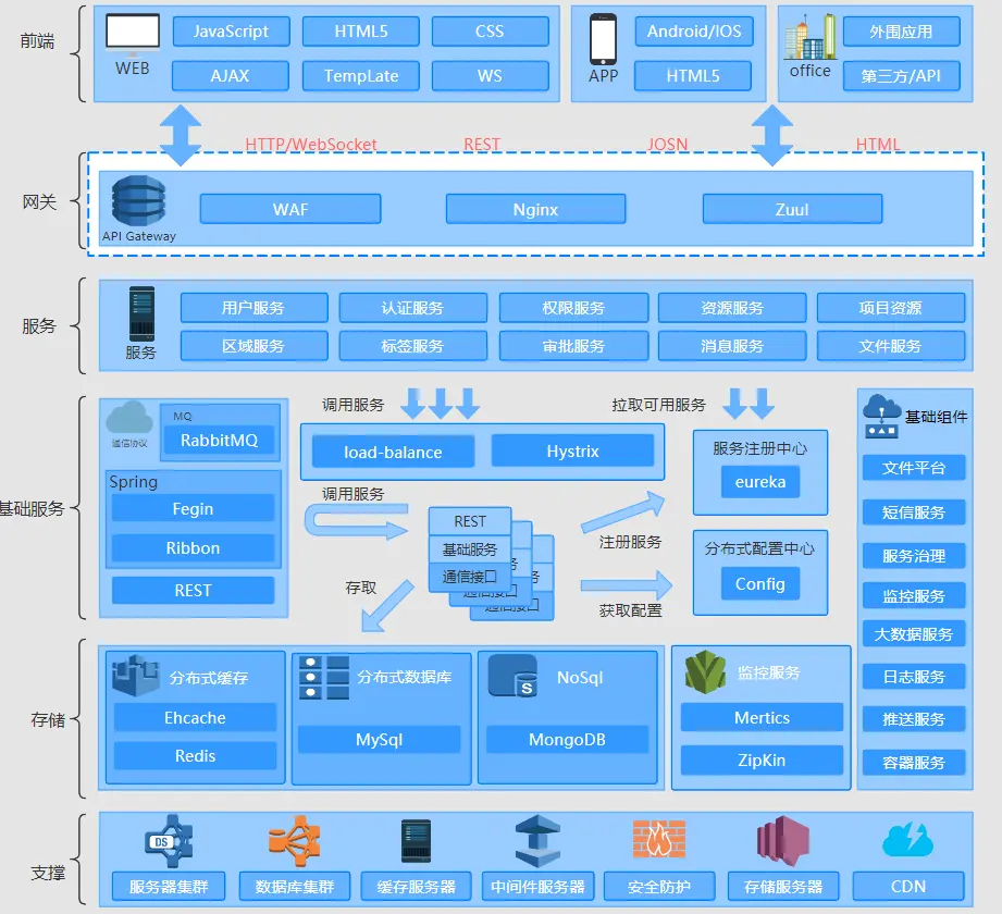 所 以 , 有 些 公 司 就 开 始 开 发 基 础 组 件 , 典 型 的 Netflix OSS 套 件(eureka/hystrix/feign/ribbon/zuul)。