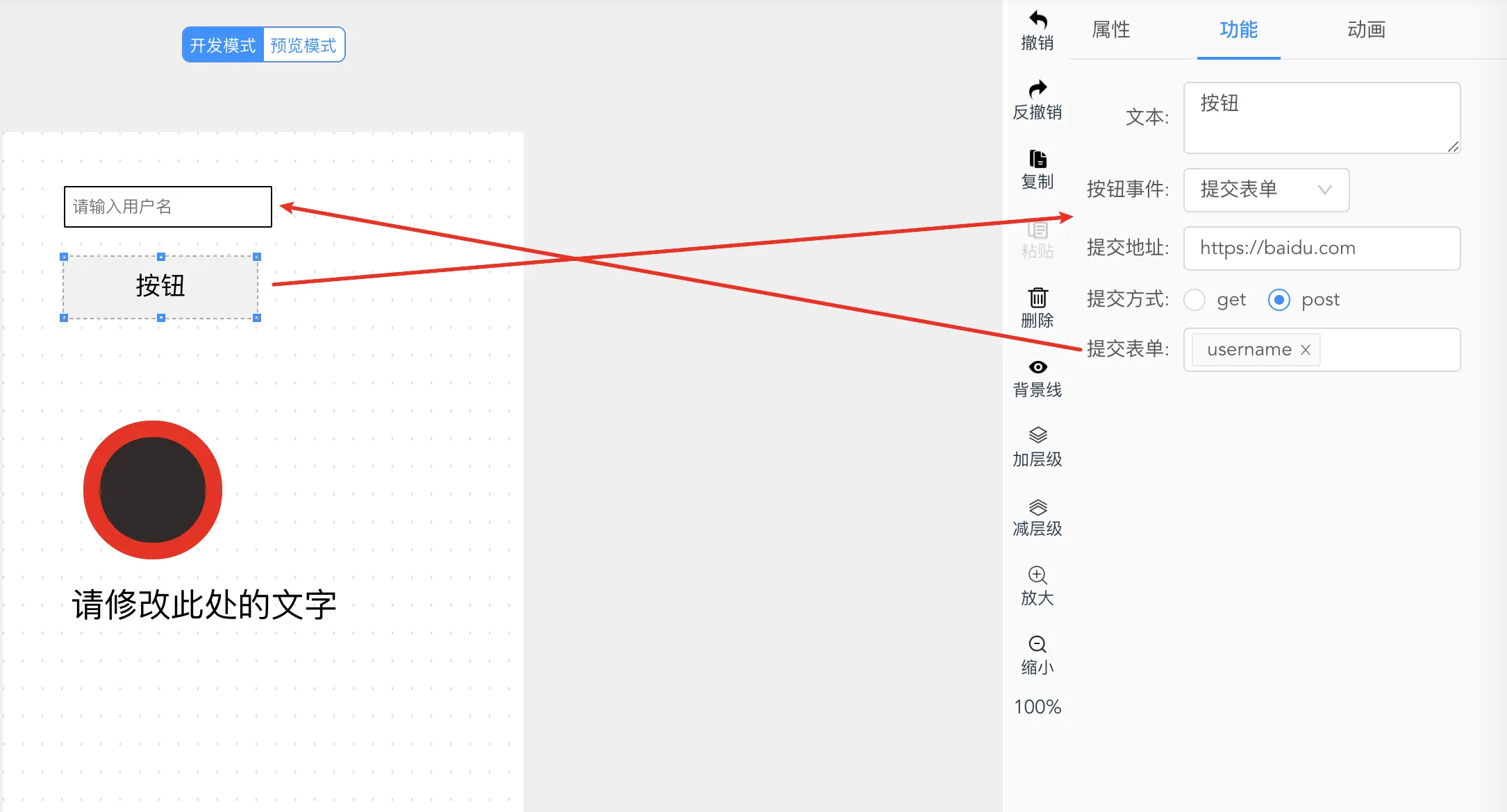 输入框名字将会作为字段提交到设置好的后台,有了这个功能,即可完成向后台提交数据的功能,生成页面也不再是静态页面,这更加适应营销页面的需求