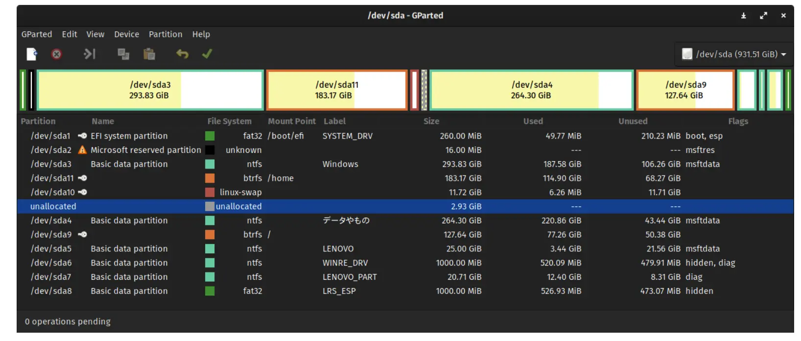 下面是一个用 GParted 进行分区的磁盘,表中的分区都被认为是 活动的(active)。