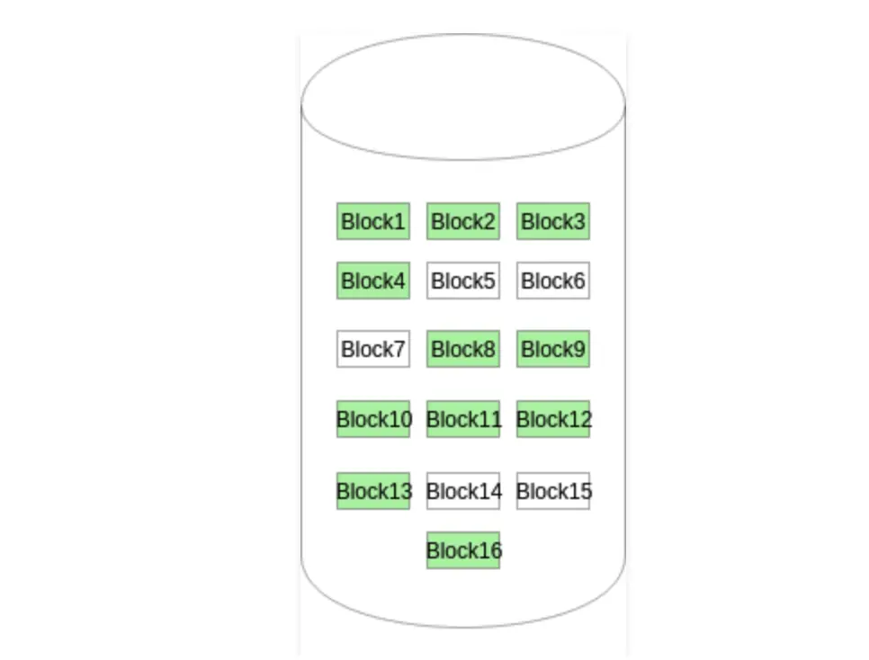 位图或位向量是一系列位或位的集合,其中每个位对应一个磁盘块,该位可以采用两个值:0和1,0表示已分配该块,而1表示一个空闲块。下图中的磁盘上给定的磁盘块实例(分配了绿色块)可以用16位的位图表示为:0000111000000110。