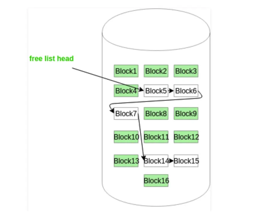 在这种方法中,空闲磁盘块链接在一起,即一个空闲块包含指向下一个空闲块的指针。第一个磁盘块的块号存储在磁盘上的单独位置,也缓存在内存中。