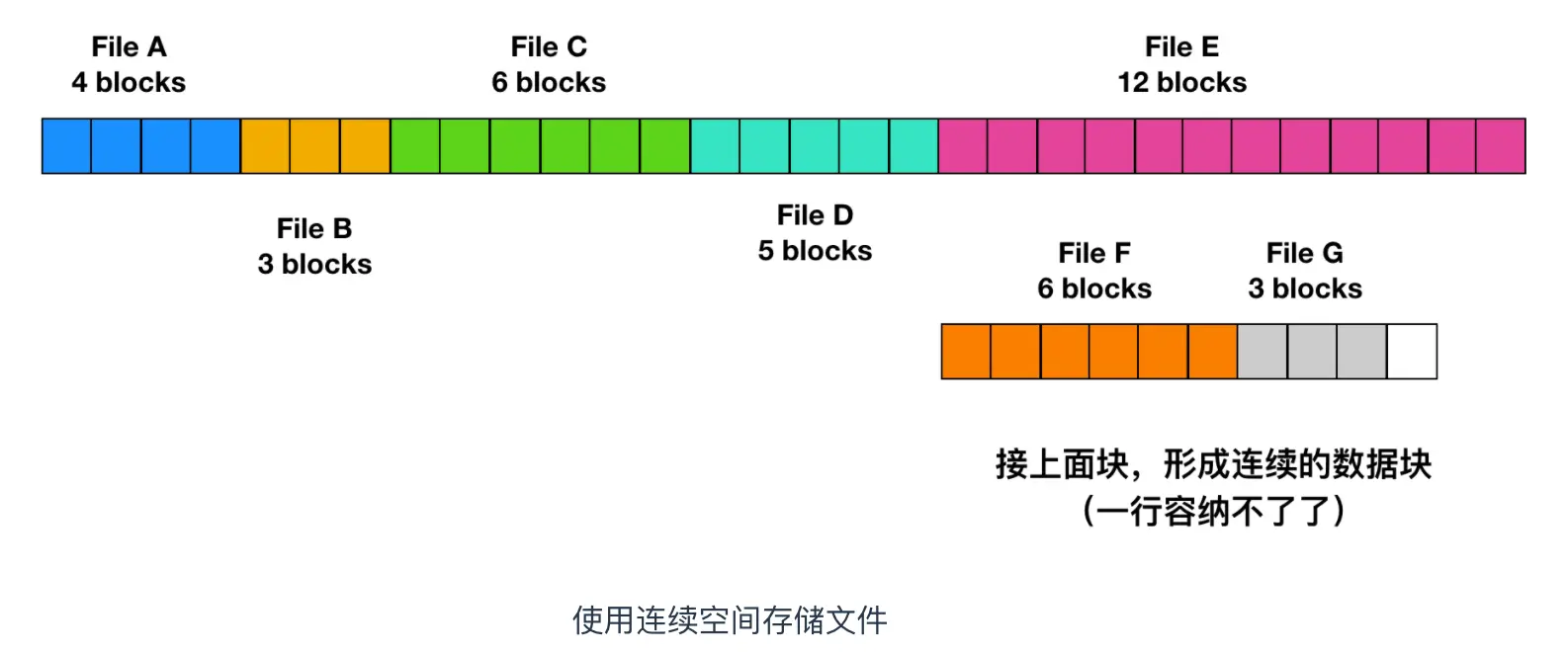 不幸的是,连续空间分配也有很明显的不足。随着时间的推移,磁盘会变得很零碎。下图解释了这种现象