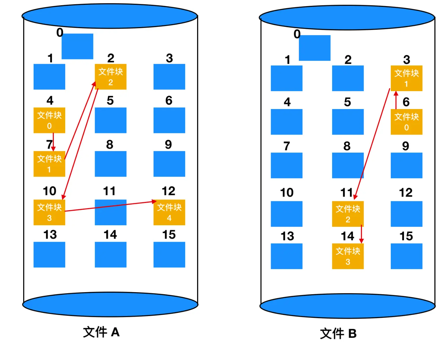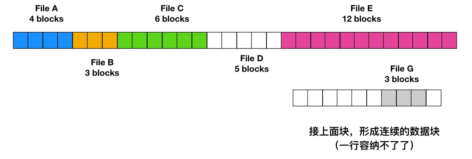 注意每个文件都会在新的文件块开始写,所以如果文件 A 只占用了 3 又 1/2 个块,那么最后一个块的部分内存会被浪费。在上面这幅图中,总共展示了 7 个文件,每个文件都会从上个文件的末尾块开始写新的文件块。