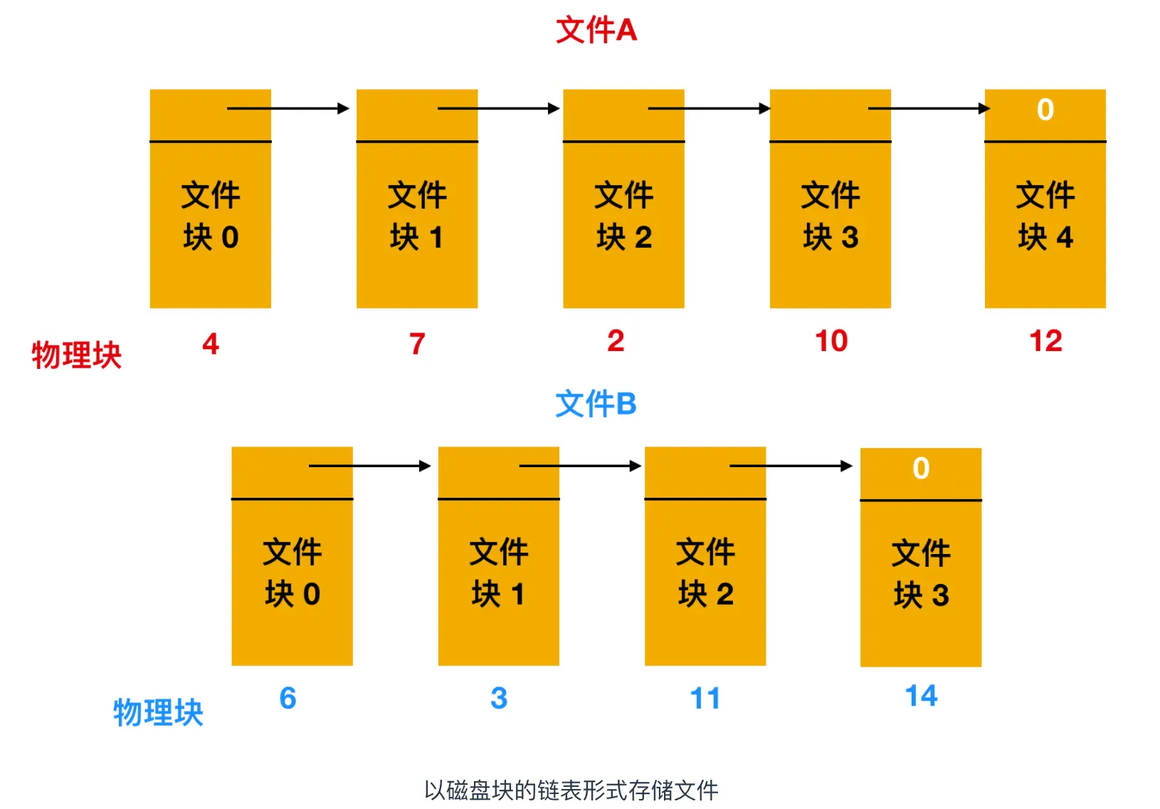 第二种存储文件的方式是为每个文件构造磁盘块链表,每个文件都是磁盘块的链接列表,就像下面所示