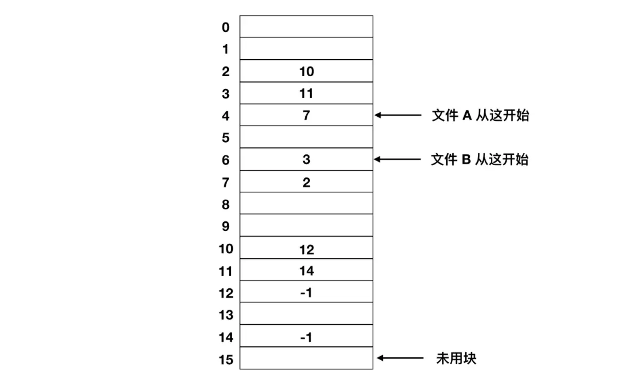 与连续分配方案不同,这一方法可以充分利用每个磁盘块。除了最后一个磁盘块外,不会因为磁盘碎片而浪费存储空间。同样,在目录项中,只要存储了第一个文件块,那么其他文件块也能够被找到。