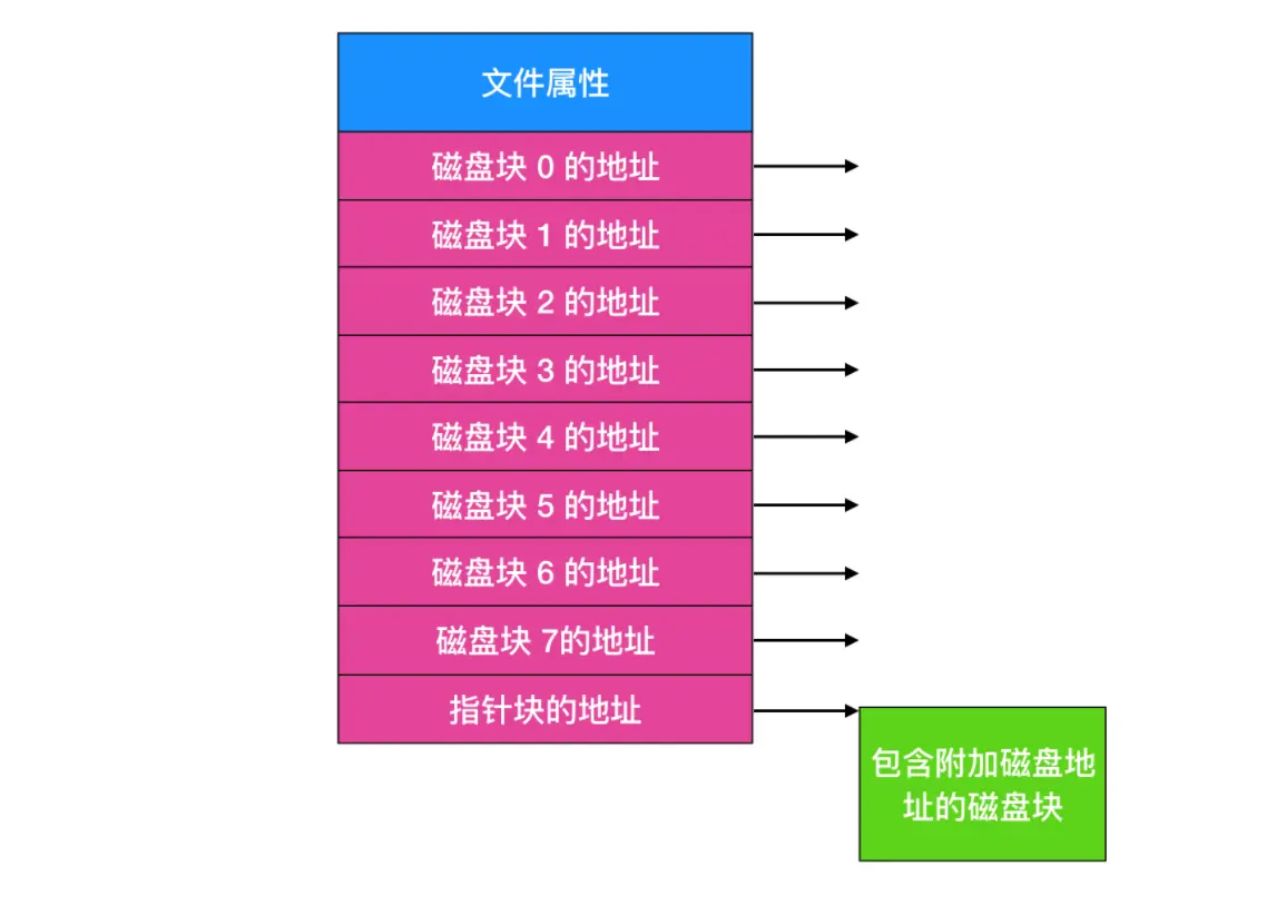 还有一个问题是,由于指针会占用一些字节,每个磁盘块实际存储数据的字节数并不再是 2 的整数次幂。虽然这个问题并不会很严重,但是这种方式降低了程序运行效率。许多程序都是以长度为 2 的整数次幂来读写磁盘,由于每个块的前几个字节被指针所使用,所以要读出一个完成的块大小信息,就需要当前块的信息和下一块的信息拼凑而成,因此就引发了查找和拼接的开销。