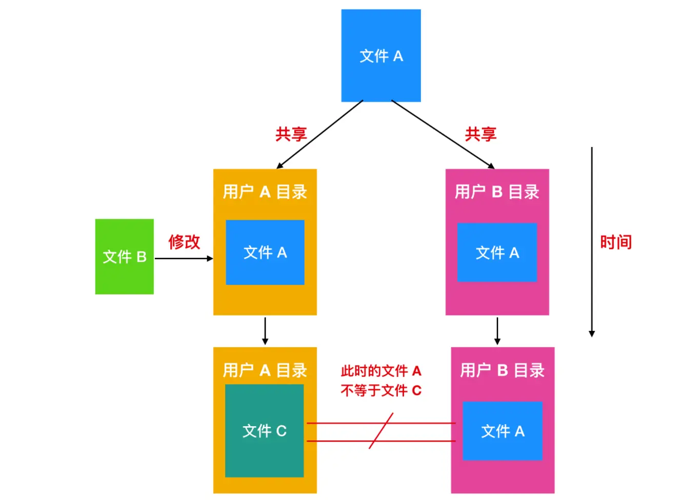 当多个用户在同一个项目中工作时,他们通常需要共享文件。如果这个共享文件同时出现在多个用户目录下,那么他们协同工作起来就很方便。下面的这张图我们在上面提到过,但是有一个更改的地方,就是 C 的一个文件也出现在了 B 的目录下。