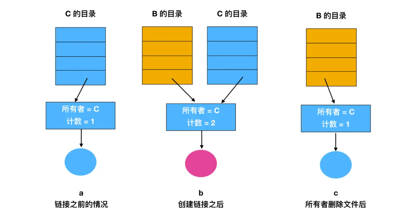 第一开始的情况如图 a 所示,此时 C 的目录的所有者是 C ,当目录 B 链接到共享文件时,并不会改变 C 的所有者关系,只是把计数 + 1,所以此时 系统知道目前有多少个目录指向这个文件。然后 C 尝试删除这个文件,这个时候有个问题,如果 C 把文件移除并清除了 inode 的话,那么 B 会有一个目录项指向无效的节点。如果 inode 以后分配给另一个文件,则 B 的链接指向一个错误的文件。系统通过 inode 可知文件仍在被引用,但是没有办法找到该文件的全部目录项以删除它们。指向目录的指针不能存储在 inode 中,原因是有可能有无数个这样的目录。