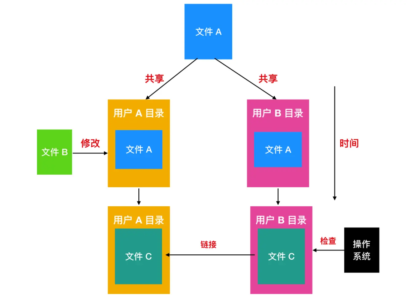 LINK的新文件,并把该文件放在 B 的目录下,使得 B 与 C 建立链接。新的文件中只包含了它所链接的文件的路径名。当 B 想要读取文件时,操作系统会检查 B 的目录下存在一个类型为 LINK 的文件,进而找到该链接的文件和路径名,然后再去读文件,这种方式称为符号链接(symbolic linking)。