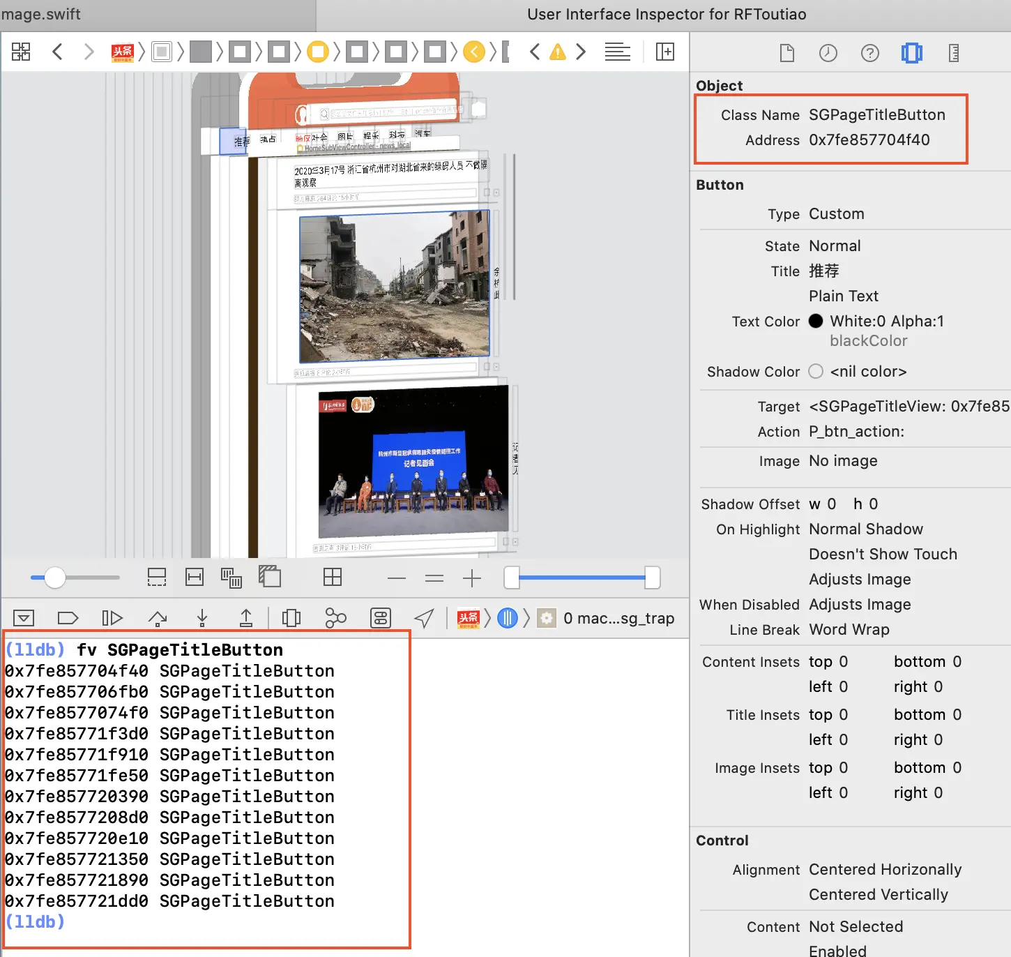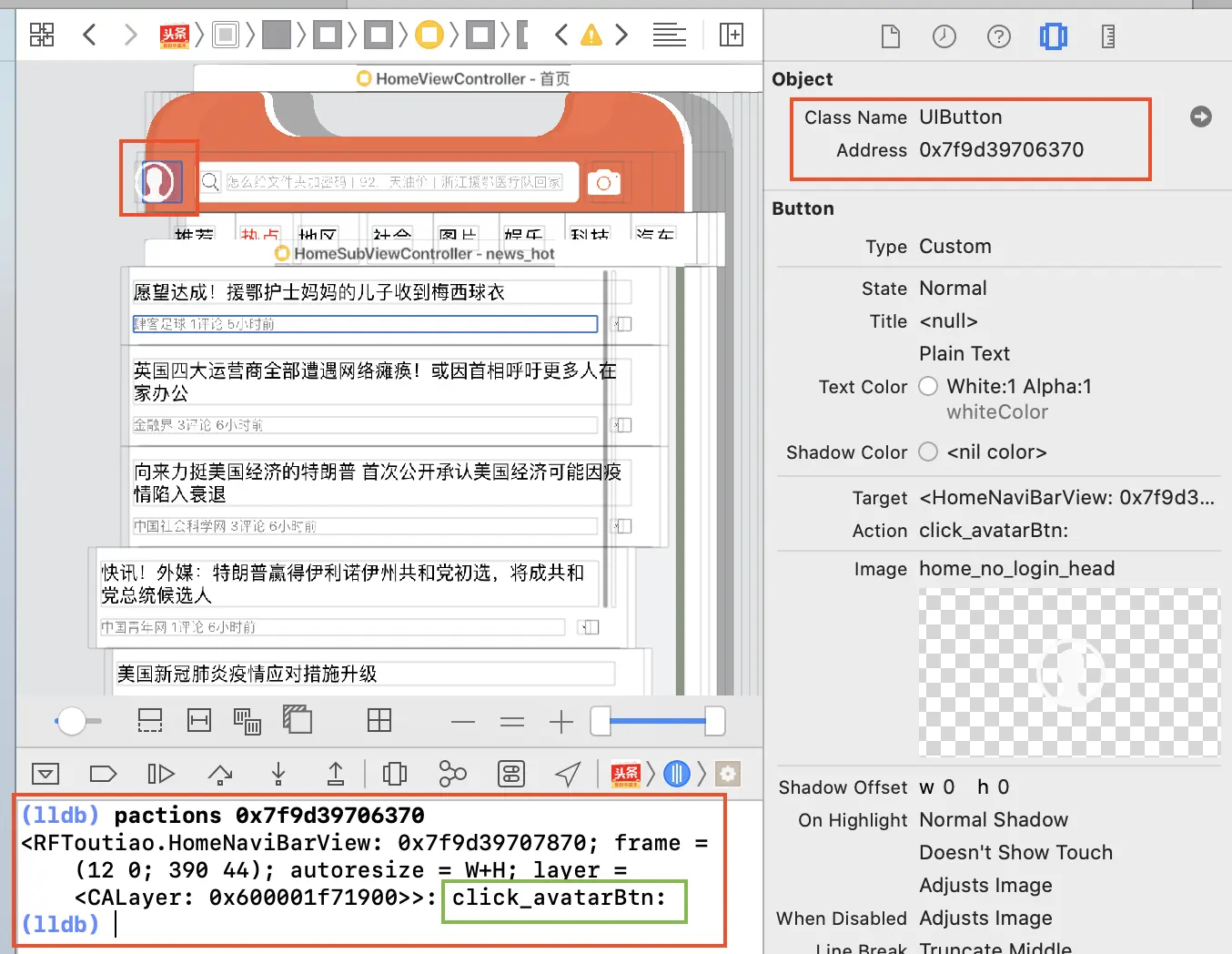 Breakpoint 1: where = RFToutiao`@objc RFToutiao.HomeNaviBarView.click_avatarBtn(Any) -> () at <compiler-generated>, address = 0x000000010311f350