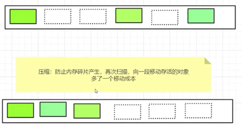 - 标记整理 防止内存碎片再次扫描,向一端移动存活对象多了移动成本