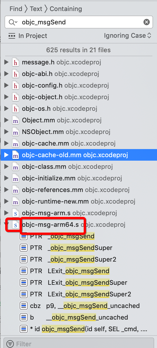 使用objc源码,我们快速定位到汇编代码处,文件的标志 s 代表汇编,这里我们主要看arm64下的源码