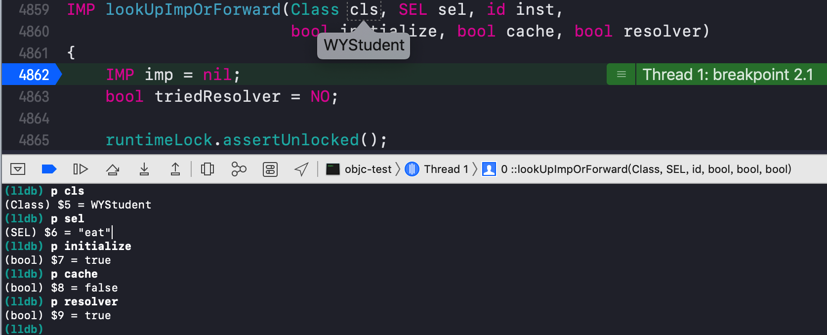 IMP imp = lookUpImpOrNil(cls, sel, inst,