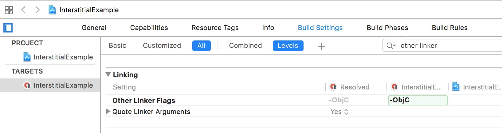 <key>GADApplicationIdentifier</key> <string>ca-app-pub-xxxxxxxxxxxxxxxxxxxxxx~xxxxxxxxxxxxxx</string> 配置导出的Xcode项目,构建设置->其他链接器标志,添加标志-ObjC