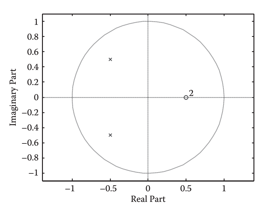 得到两个零点,它们都在 ,将它们画在复平面上,可以发现所有极点都在单位圆内,因此这个滤波器是稳定的;所有零点都在单位圆内,因此它是最小相位的