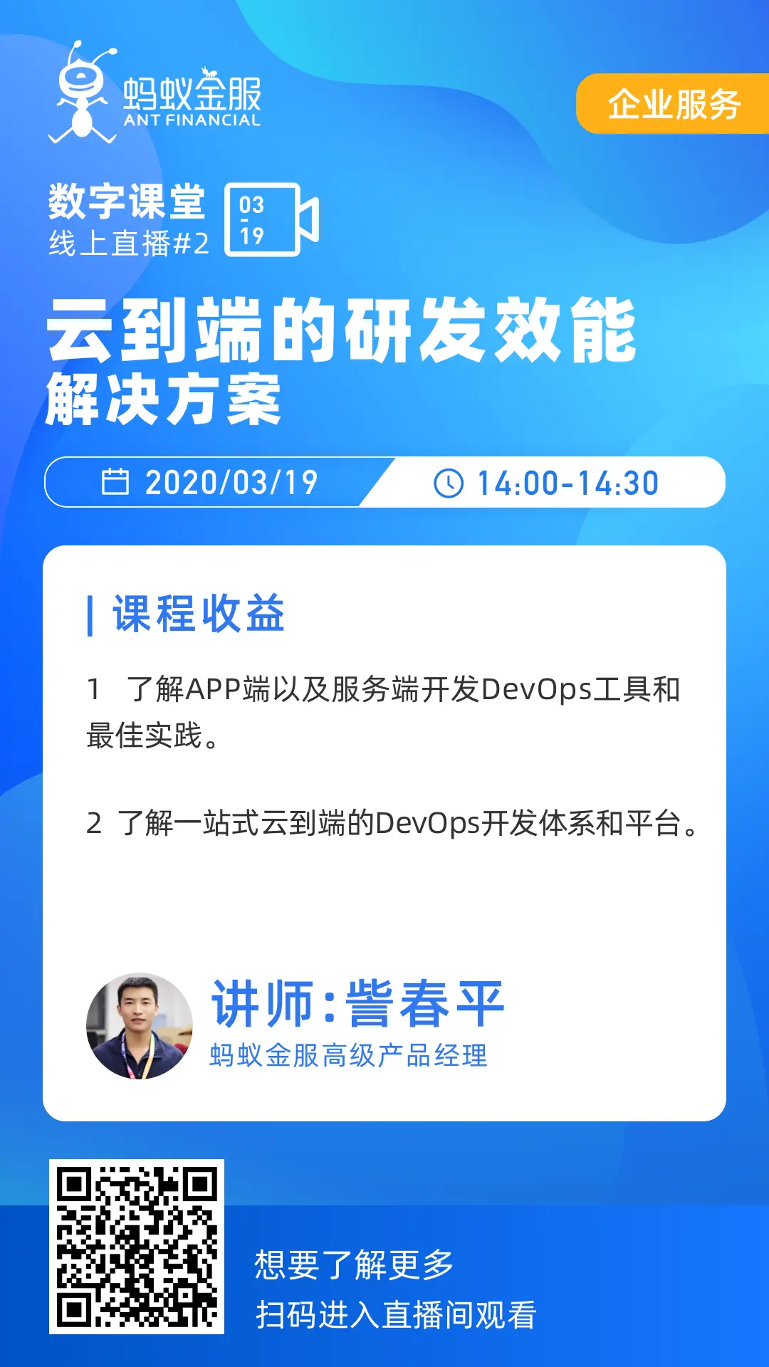 想了解更多有关支付宝APP端以及服务端开发DevOps工具和最佳实践,这场在线直播不容错过!扫描二维码或点击链接即可参与直播互动,3月19日下午14:00-14:30,不见不散~~