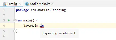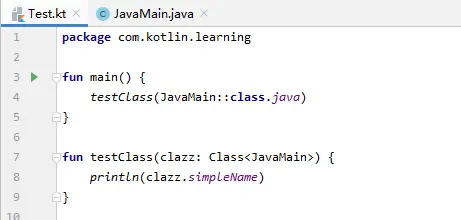 使用 Java 时我们有的时候传递某个类的 class,但是在 Kotlin 中调用 Java 类的 class 需要在后面追加 .java,例如我们有一个 JavaMain.java 的 Java 类,我们使用它的 class 时则需要这样调用:JavaMain::class.java。