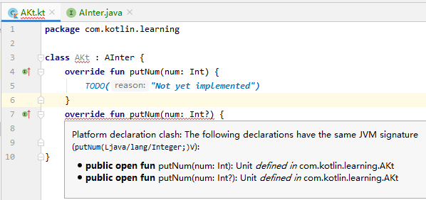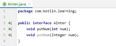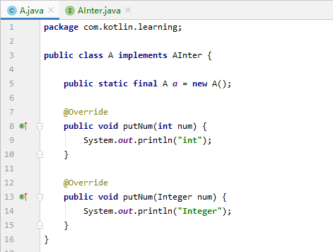 你会发现只调用了 int 参数的方法,通过这个示例可以看出来 Kotlin 是没有封装类的概念的,为了进一步说明,我们让 Kotlin 的类来实现这个接口: