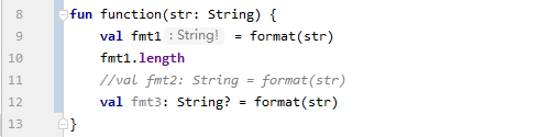 首先看第一种编译器推断类型的方式,当我们使用编译器查看类型时你会发现它返回的是 String! 的类型,这种类型我们不能直接声明,这是 Kotlin 与 Java 互调时的一种特有的类型,也可以说成是 Java 的 String 类型。