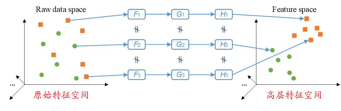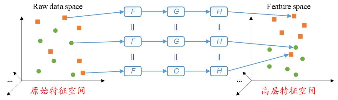 如下图所示,我们如果以左边的散点图表示原始特征空间,以右边的散点图表示人工神经网络所学习得到的高层特征空间,以散点图中的小圆点和小方块代表两种不同类别的样本,以F、G和H表示非线性函数。那么这些样本是通过相同的非线性函数实现原始特征空间到高层特征空间的变换的。也就是说,图片中的“=”意味着,对于这些样本,它们所经历的非线性变换是完全相同的。