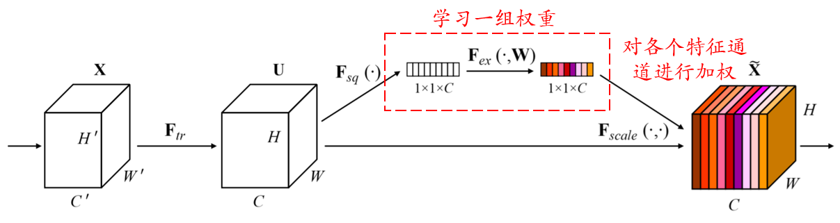 为了达到这个目的,SENet通过一个小型的全连接网络,学习得到了一组权重系数,对原先特征图的各个通道进行加权。通过这种方式,每个样本(包括训练样本和测试样本)都有着自己独特的一组权重,用于自身各个特征通道的加权。这其实是一种注意力机制,即注意到重要的特征通道,进而赋予其较高的权重。