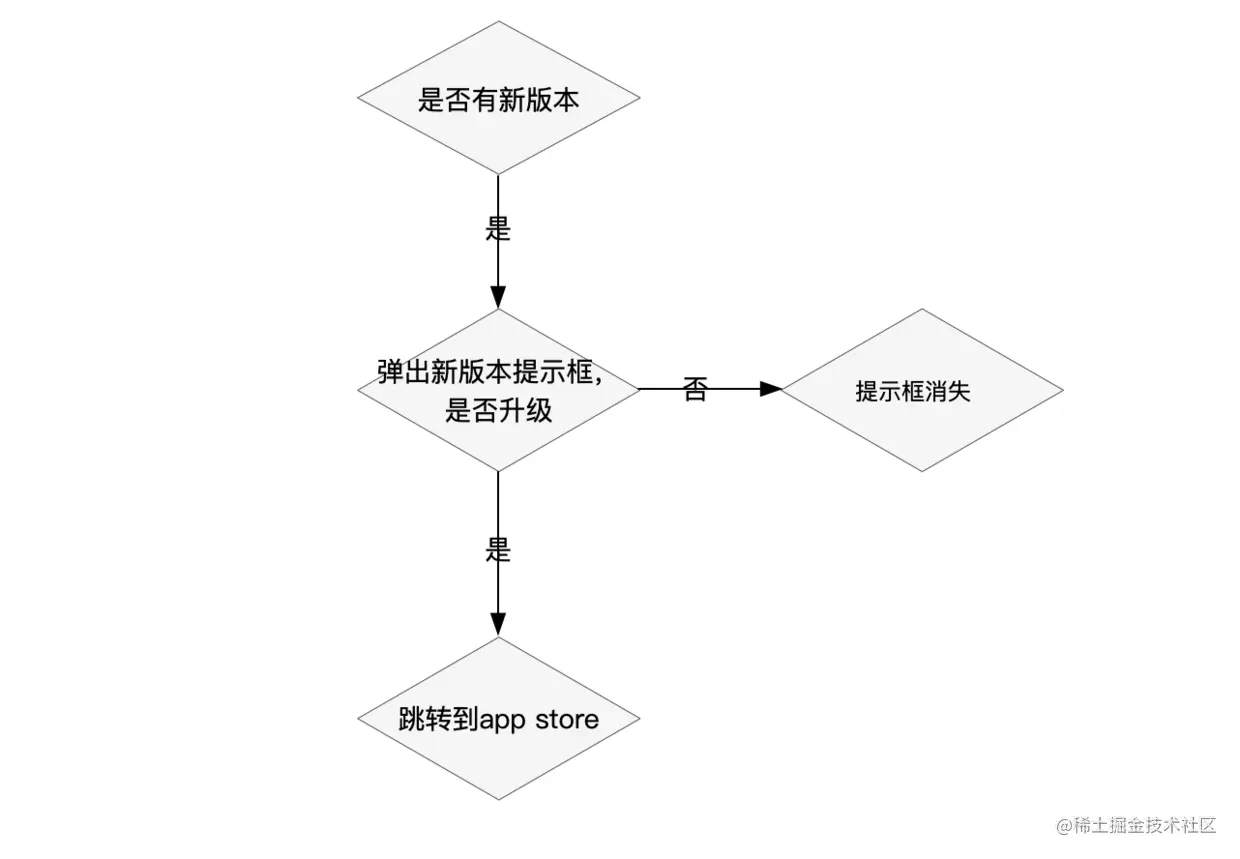 - 通常我们会访问后台接口获取是否有新的版本,如果有新的版本则弹出提示框,判断当前版本是否为“强制升级”,如果是则只提供用户一个“升级”的按钮,否则提供用户“升级”和“取消”按钮。
