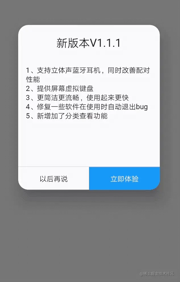 默认“取消”按钮文本是"以后再说",默认“升级”按钮的文本是“立即体验”。