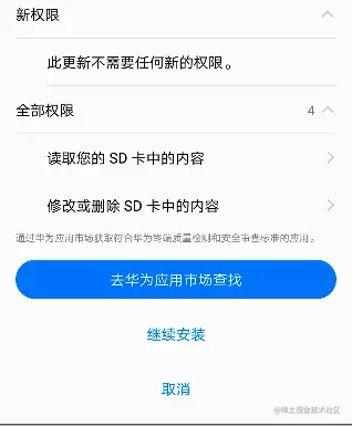- 如果跳转到应用市场升级,判断是否指定了应用市场,比如只在华为应用市场上架了,那么此时需要指定跳转到华为应用市场,即使你在很多应用市场都上架了,也应该根据用户手机安装的应用市场指定一个应用市场,让用户选择应用市场不是一个好的体验,而且用户也不知道应该去哪个市场更新,如果用户选择了一个你没有上架的应用市场,那就更尴尬了。