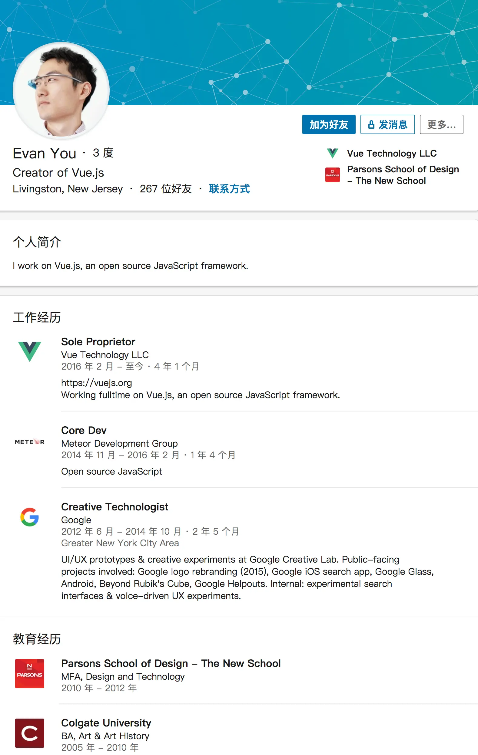 Vue.js 的作者尤雨溪讲了自己作为开发者的四个阶段:学生阶段、就职 Google 阶段、就职 Meteor 阶段和全职 Vue 阶段。这与他的 LinkedIn 个人主页也是对应的: