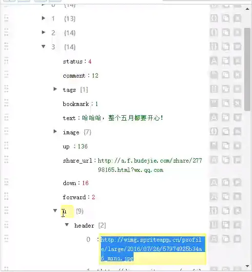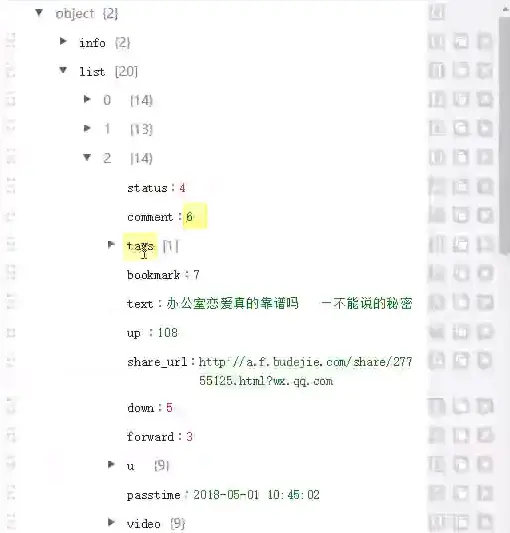 String json = "{\"info\": {\"count\": 4387, \"np\": 1525135442}, \"list\": [{\"status\": 4, \"comment\": \"2\", \"tags\": [{\"post_number\": 1479167, \"image_list\": \"http://img.spriteapp.cn/ugc/2015/01/23/180558_65251.jpg\", \"forum_sort\": 0, \"forum_status\": 2, \"id\": 55, \"info\": \"\", \"name\": \"\\u5fae\\u89c6\\u9891\", \"colum_set\": 1, \"tail\": \"\", \"sub_number\": 96461, \"display_level\": 0}], \"bookmark\": \"0\", \"text\": \"\\u7537\\u670b\\u53cb\\u770b\\u4e0a\\u95fa\\u871c\\u600e\\u4e48\\u529e\\uff1f\\u6700\\u4e0d\\u613f\\u610f\\u8ddf\\u95fa\\u871c\\u5728\\u4e00\\u8d77\\u505a\\u4ec0\\u4e48\\uff1f\\u95fa\\u871c\\u6bd4\\u4f60\\u6f02\\u4eae\\u600e\\u4e48\\u529e\\uff1f\\u68c0\\u9a8c\\u95fa\\u871c\\u60c5\\u7684\\u65f6\\u5019\\u5230\\u4e86\\uff0c\\u4f60\\u4eec\\u5230\\u5e95\\u662f\\u4e0d\\u662f\\u5851\\u6599\\u59d0\\u59b9\\u82b1\\u5462\\uff1f\", \"up\": \"61\", \"share_url\": \"http://a.f.budejie.com/share/27736623.html?wx.qq.com\", \"down\": 6, \"forward\": 0, \"u\": {\"header\": [\"http://wimg.spriteapp.cn/profile/large/2018/04/27/5ae299b4111ee_mini.jpg\", \"http://dimg.spriteapp.cn/profile/large/2018/04/27/5ae299b4111ee_mini.jpg\"], \"uid\": \"14941107\", \"is_vip\": false, \"is_v\": true, \"room_url\": \"\", \"room_name\": \"\", \"room_role\": \"\", \"room_icon\": \"\", \"name\": \"\\u6a58\\u5b50\\u5a31\\u4e50\\u5b98\\u65b9\"}, \"passtime\": \"2018-05-01 10:56:02\", \"video\": {\"playfcount\": 8, \"height\": 600, \"width\": 1066, \"video\": [\"http://wvideo.spriteapp.cn/video/2018/0425/5ae059947586a_wpd.mp4\", \"http://dvideo.spriteapp.cn/video/2018/0425/5ae059947586a_wpd.mp4\"], \"download\": [\"http://wvideo.spriteapp.cn/video/2018/0425/5ae059947586a_wpdm.mp4\", \"http://dvideo.spriteapp.cn/video/2018/0425/5ae059947586a_wpdm.mp4\"], \"duration\": 236, \"playcount\": 972, \"thumbnail\": [\"http://wimg.spriteapp.cn/picture/2018/0425/5ae059947586a_wpd.jpg\", \"http://dimg.spriteapp.cn/picture/2018/0425/5ae059947586a_wpd.jpg\"], \"thumbnail_small\": [\"http://wimg.spriteapp.cn/crop/150x150/picture/2018/0425/5ae059947586a_wpd.jpg\", \"http://dimg.spriteapp.cn/crop/150x150/picture/2018/0425/5ae059947586a_wpd.jpg\"]}, \"type\": \"video\", \"id\": \"27736623\"}, {\"status\": 4, \"comment\": \"0\", \"tags\": [{\"post_number\": 10257063, \"image_list\": \"http://img.spriteapp.cn/ugc/2017/02/07/112043_42864.png\", \"forum_sort\": 0, \"forum_status\": 2, \"id\": 1, \"info\": \"\\u641e\\u7b11\\u96c6 \\u89c6\\u9891\\u5e26\\u5f2f \\u56fe\\u6587\\u95ea\\u8170 \", \"name\": \"\\u641e\\u7b11\\u96c6\", \"colum_set\": 1, \"tail\": \"\", \"sub_number\": 194846, \"display_level\": 0}, {\"post_number\": 1855861, \"image_list\": \"http://img.spriteapp.cn/ugc/2014/12/09/185915_98540.JPG\", \"forum_sort\": 0, \"forum_status\": 2, \"id\": 60, \"info\": \"\", \"name\": \"\\u5410\\u69fd1\", \"colum_set\": 1, \"tail\": \"\", \"sub_number\": 96382, \"display_level\": 0}, {\"post_number\": 1329961, \"image_list\": \"http://img.spriteapp.cn/ugc/2017/07/c9feeb92703211e7bf00842b2b4c75ab.png\", \"forum_sort\": 0, \"forum_status\": 2, \"id\": 64, \"info\": \"\", \"name\": \"\\u7cd7\\u4e8b\", \"colum_set\": 1, \"tail\": \"\\u4e2a\\u56e7\\u795e\", \"sub_number\": 67954, \"display_level\": 0}], \"bookmark\": \"2\", \"text\": \"\\u5168\\u5bb6\\u4e00\\u5757\\u770b\\u7535\\u89c6\\uff0c\\u5ab3\\u5987\\u6492\\u5a07\\u7684\\u95ee\\u6211\\uff1a\\u201c\\u4f60\\u662f\\u4e0d\\u662f\\u53c8\\u5acc\\u6211\\u70e6\\u4e86\\uff1f\\u55ef\\uff1f\\u201d\\u6211\\u8d76\\u7d27\\u966a\\u7b11\\u7740\\u8bf4\\uff1a\\u201c\\u6211\\u7279\\u4e48\\u5c31\\u662f\\u5acc\\u5168\\u4e16\\u754c\\u70e6\\u4e5f\\u4e0d\\u4f1a\\u5acc\\u4f60\\u70e6\\u54c7\\uff01\\u201d\\u8fd9\\u65f6\\u5019\\u8001\\u5988\\u7a81\\u7136\\u4e00\\u672c\\u6b63\\u7ecf\\u7684\\u5bf9\\u5ab3\\u5987\\u8bf4\\uff1a\\u201c\\u6211\\u513f\\u5b50\\u96be\\u9053\\u90fd\\u6ca1\\u6709\\u8bf4\\u8fc7\\u4f60\\u5c31\\u662f\\u4ed6\\u7684\\u5168\\u4e16\\u754c\\u4e4b\\u7c7b\\u7684\\u8bdd\\u5417 \\uff1f\\u201d\\u5ab3\\u5987\\u6123\\u4e86\\u4e00\\u4e0b\\uff0c\\u7acb\\u523b\\u548c\\u6211\\u6253\\u4e86\\u8d77\\u6765\\u3002\", \"up\": \"26\", \"share_url\": \"http://a.f.budejie.com/share/23958862.html?wx.qq.com\", \"down\": 4, \"forward\": 1, \"u\": {\"header\": [\"http://wimg.spriteapp.cn/profile\", \"http://dimg.spriteapp.cn/profile\"], \"uid\": \"19569669\", \"is_vip\": false, \"is_v\": false, \"room_url\": \"\", \"room_name\": \"\\u60f3\\u65e0\\u5566\", \"room_role\": \"\", \"room_icon\": \"http://wimg.spriteapp.cn/ugc/2016/1101/gang_level_3.png\", \"name\": \"\\u611b\\u4e45-\\u898b\\u4eba\\u5fc3 [\\u60f3\\u65e0\\u5566]\"}, \"passtime\": \"2018-05-01 10:55:47\", \"type\": \"text\", \"id\": \"23958862\"}, {\"status\": 4, \"comment\": \"6\", \"tags\": [{\"post_number\": 309, \"image_list\": \"\", \"forum_sort\": 0, \"forum_status\": 2, \"id\": 3394, \"info\": \"\", \"name\": \"\\u98de\\u789f\\u8bf4\", \"colum_set\": 1, \"tail\": null, \"sub_number\": 544, \"display_level\": 0}], \"bookmark\": \"7\", \"text\": \"\\u529e\\u516c\\u5ba4\\u604b\\u7231\\u771f\\u7684\\u9760\\u8c31\\u5417 \\u2014\\u4e0d\\u80fd\\u8bf4\\u7684\\u79d8\\u5bc6\", \"up\": \"108\", \"share_url\": \"http://a.f.budejie.com/share/27755125.html?wx.qq.com\", \"down\": 5, \"forward\": 3, \"u\": {\"header\": [\"http://g4.ykimg.com/0130391F4550C56DD7AA1407ED6213E519694D-D9C7-14FA-CF4B-31B1E30AB9E5\", \"http://g4.ykimg.com/0130391F4550C56DD7AA1407ED6213E519694D-D9C7-14FA-CF4B-31B1E30AB9E5\"], \"uid\": \"9123632\", \"is_vip\": false, \"is_v\": false, \"room_url\": \"\", \"room_name\": \"\\u767e\\u601d\\u98de\\u789f\\u8bf4\", \"room_role\": \"\\u5e2e\\u4e3b\", \"room_icon\": \"http://wimg.spriteapp.cn/ugc/2016/1101/gang_level_1.png\", \"name\": \"\\u98de\\u789f\\u8bf4 [\\u767e\\u601d\\u98de\\u789f\\u8bf4]\"}, \"passtime\": \"2018-05-01 10:45:02\", \"video\": {\"playfcount\": 102, \"height\": 480, \"width\": 640, \"video\": [\"http://wvideo.spriteapp.cn/video/2018/0427/ce13c9bc-49af-11e8-bd3f-1866daeb0df1_wpd.mp4\", \"http://dvideo.spriteapp.c