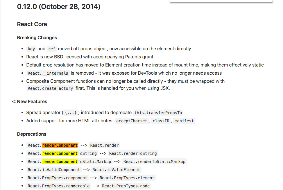 在应用比较广泛的版本,比如reactv15.0.0中,组件初始挂载的入口函数叫render,相信是人尽皆知的。可能很少人知道这个render函数以前是叫renderComponent。那react是在哪个版本中做了这个change呢?我们看看changelog就知道了: