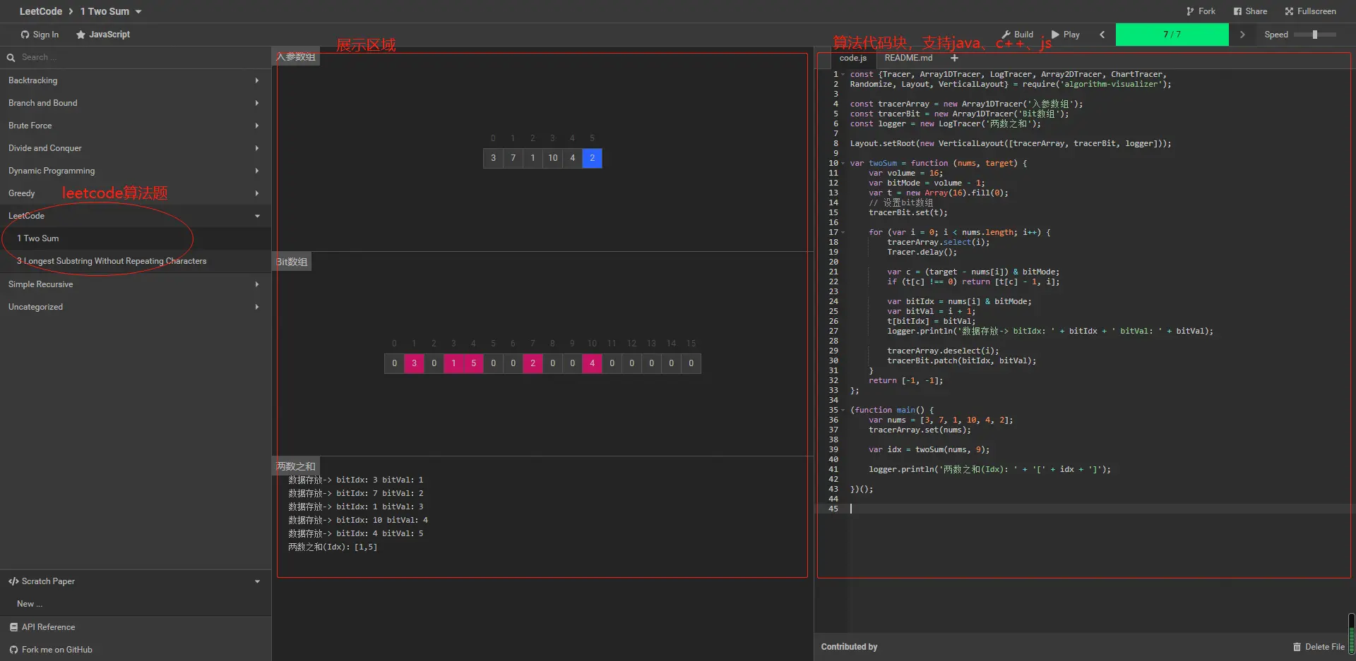 algorithms中的算法代码。不支持中文以及特殊符号 - 中间是展示运行过程区域,这部分主要来自于在算法代码中添加的展示化代码块,例如: