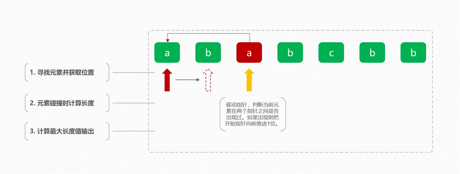 - 另外在比对是否撞上相同元素的时候,可以输出当前开始指针与结束指针中间的长度,并与之前的记录的值比对,如果超过则更新,直到最后输出。