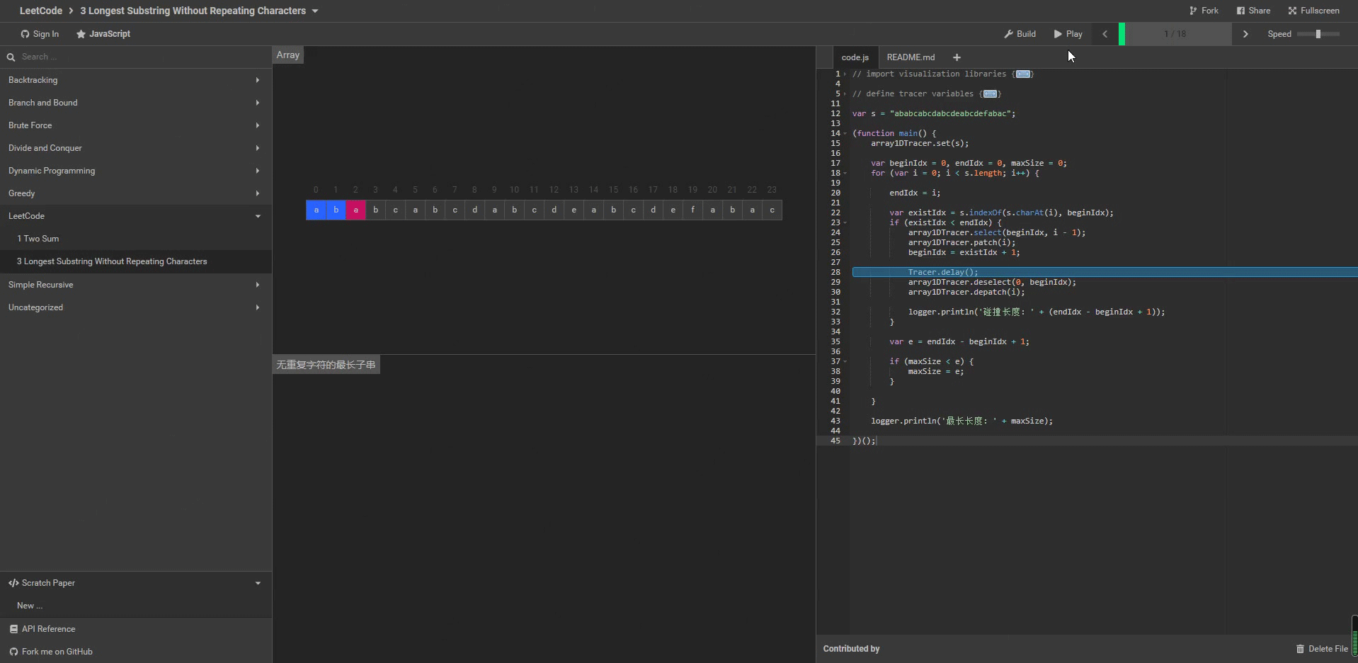 array1DTracer.select(beginIdx, i - 1); - 最右侧是代码区域,这里的代码可以修改后构建并运行,但不会保存。同时在运行的时候可以调整运行速度