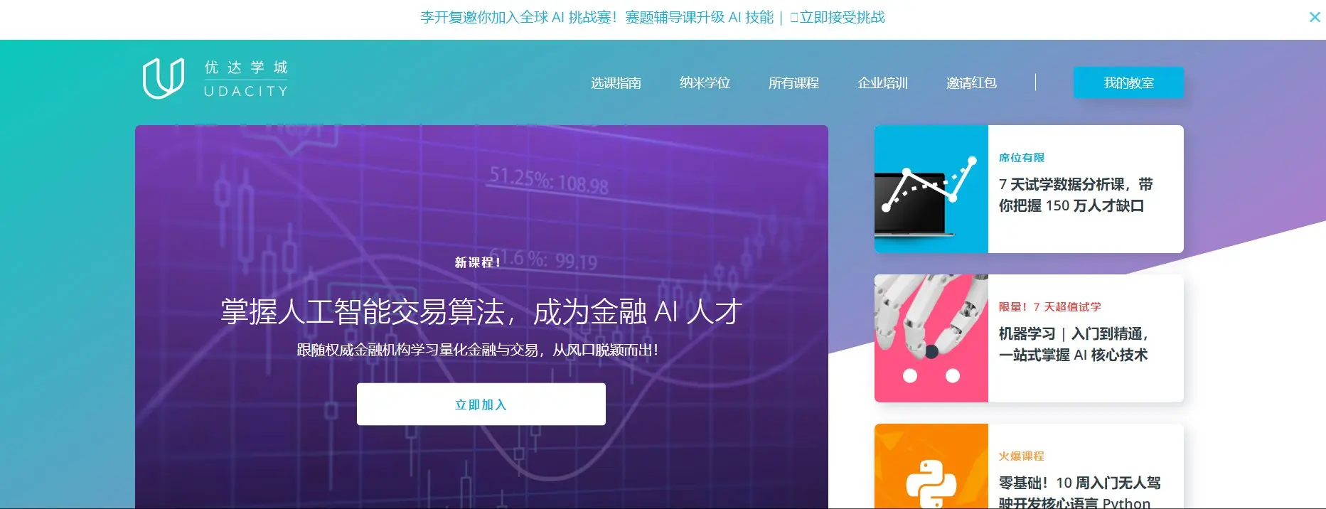 优达学城:cn.udacity.com/ 优达学城 (Udacity) 是一所在线的“硅谷大学”,由来自硅谷的技术领袖设计课程,让每个人都能免费在线学习世界最高水平的IT课程。所有的课程都由顶尖教育专家和业内专家共同开发,介绍最前沿的知识。不论你是想进入科技领域,还是希望更好地使用你的新技能,都可以在课程中学到所需技能,提升职业竞争力。我们与企业保持密切的合作关系,确保学生在课程中学到的技能,正是雇主最需要的。