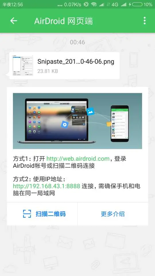 如果想从手机传输文件到电脑,那有以下几种方式 ①下载客户端软件,因为手机上的文件可以直接分享到AirDroid客户端软件,在电脑客户端软件可以接收,网页版不可以 ②直接打开网页版的手机上的文件管理,找到文件直接暴力复制