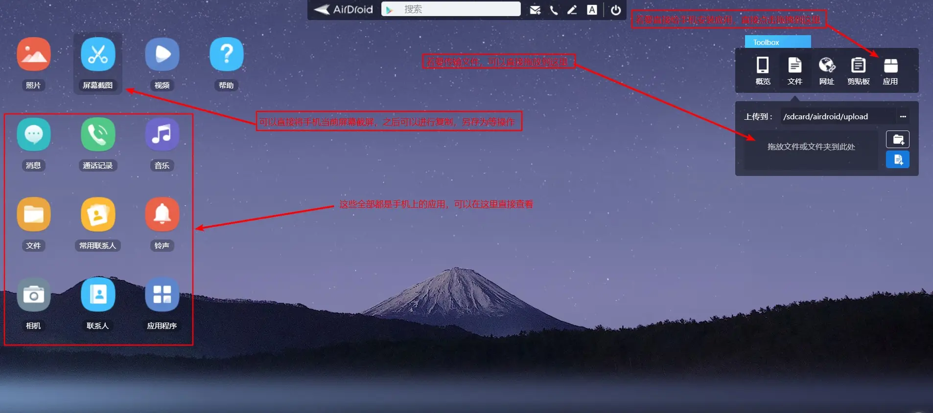 AirDroid:www.airdroid.com/zh-cn/ 无需数据线,让手机和电脑共享起来 AirDroid功能十分强大,不仅仅可以在电脑与手机之间轻松传图片、文档、链接等内容, 还可以将手机屏幕映射到电脑上,利用鼠标实时操作手机,键盘输入文字,截图录影更加方便。 而这一切,仅仅在手机端安装一个APP即可,电脑端在网页即可操作。手机安装APP后访问网页版地址 文件传输具体使用方法:手机下载AirDroid软件之后,打开软件,进入AirDroid网页端
