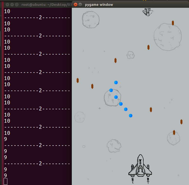 001 002 003 004 005 006 007 008 009 010 011 012 013 014 015 016 017 018 019 020 021 022 023 024 025 026 027 028 029 030 031 032 033 034 035 036 037 038 039 040 041 042 043 044 045 046 047 048 049 050 051 052 053 054 055 056 057 058 059 060 061 062 063 064 065 066 067 068 069 070 071 072 073 074 075 076 077 078 079 080 081 082 083 084 085 086 087 088 089 090 091 092 093 094 095 096 097 098 099 100 101 102 103 104 105 106 107 108 109 110 111 112 113 114 115 116 117 118 119 120 121 122 123 124 125 126 127 128 129 130 131 132 133 134 135 136 137 138 139 140 141 142 143 144 145 146 147 148 149 150 151 152 153 154 155 156 157 158 159 160 161 162 163 164 165 166 167 168 169 170 171 172 173 174 175 176 177 178 179 180 181 182 183 184 185 186 187 188 189 190 191 192 193 194 195 196 197 198 199 200 201 202 203 204 205 206 207 208 209 210 211 212 213 214 215 216 | #coding=utf-8import pygamefrom pygame.locals import *import timeimport random ''' 9. 让敌机发射子弹''' class HeroPlane(object): def __init__(self,screen): #设置飞机默认的位置 self.x = 230 self.y = 700 #设置要显示内容的窗口 self.screen = screen self.imageName = "./feiji/hero1.png" self.image = pygame.image.load(self.imageName) #用来存储英雄飞机发射的所有子弹 self.bulletList = [] def display(self): self.screen.blit(self.image,(self.x,self.y)) #判断一下子弹的位置是否越界,如果是,那么就要删除这颗子弹 # #这种方法会漏掉很多需要删除的数据 # for i in self.bulletList: # if i.y<0: # self.bulletList.remove(i) #用来存放需要删除的对象引用 needDelItemList = [] #保存需要删除的对象 for i in self.bulletList: if i.judge(): needDelItemList.append(i) #删除self.bulletList中需要删除的对象 for i in needDelItemList: self.bulletList.remove(i) #因为needDelItemList也保存了刚刚删除的对象的引用,所以可以删除整个列表,那么 #整个列表中的引用就不存在了,也可以不调用下面的代码,因为needDelItemList是局部变量 #当这个方法的调用结束时,这个局部变量也就不存在了 # del needDelItemList for bullet in self.bulletList: bullet.display()#显示一个子弹的位置 bullet.move()#让这个子弹进行移动,下次再显示的时候就会看到子弹在修改后的位置 def moveLeft(self): self.x -= 10 def moveRight(self): self.x += 10 def sheBullet(self): newBullet = Bullet(self.x, self.y, self.screen) self.bulletList.append(newBullet) class Bullet(object): def __init__(self,x,y,screen): self.x = x+40 self.y = y-20 self.screen = screen self.image = pygame.image.load("./feiji/bullet.png") def move(self): self.y -= 5 def display(self): self.screen.blit(self.image,(self.x,self.y)) def judge(self): if self.y<0: return True else: return False class EnemyPlane(object): def __init__(self,screen): #设置飞机默认的位置 self.x = 0 self.y = 0 #设置要显示内容的窗口 self.screen = screen self.imageName = "./feiji/enemy0.png" self.image = pygame.image.load(self.imageName) self.direction = "right" #用来存储敌人飞机发射的所有子弹 self.bulletList = [] def display(self): self.screen.blit(self.image,(self.x,self.y)) #判断一下子弹的位置是否越界,如果是,那么就要删除这颗子弹 # #这种方法会漏掉很多需要删除的数据 # for i in self.bulletList: # if i.y<0: # self.bulletList.remove(i) #存放需要删除的对象信息 needDelItemList = [] for i in self.bulletList: if i.judge(): needDelItemList.append(i) for i in needDelItemList: self.bulletList.remove(i) # del needDelItemList #更新及这架飞机发射出的所有子弹的位置 for bullet in self.bulletList: bullet.display() bullet.move() def move(self): #如果碰到了右边的边界,那么就往左走,如果碰到了左边的边界,那么就往右走 if self.direction == "right": self.x += 4 elif self.direction == "left": self.x -= 4 if self.x>480-50: self.direction = "left" elif self.x<0: self.direction = "right" def sheBullet(self): num = random.randint(1,100) if num == 88: newBullet = EnemyBullet(self.x,self.y,self.screen) self.bulletList.append(newBullet) class EnemyBullet(object): def __init__(self,x,y,screen): self.x = x+30 self.y = y+30 self.screen = screen self.image = pygame.image.load("./feiji/bullet1.png") def move(self): self.y += 4 def display(self): self.screen.blit(self.image,(self.x,self.y)) def judge(self): if self.y>852: return True else: return False def key_control(heroPlane): #判断是否是点击了退出按钮 for event in pygame.event.get(): # print(event.type) if event.type == QUIT: print("exit") exit() elif event.type == KEYDOWN: if event.key == K_a or event.key == K_LEFT: print('left') heroPlane.moveLeft() #控制飞机让其向左移动 elif event.key == K_d or event.key == K_RIGHT: print('right') heroPlane.moveRight() elif event.key == K_SPACE: print('space') heroPlane.sheBullet() def main(): #1. 创建一个窗口,用来显示内容 screen = pygame.display.set_mode((480,852),0,32) #2. 创建一个和窗口大小的图片,用来充当背景 background = pygame.image.load("./feiji/background.png") #3.1 创建一个飞机对象 heroPlane = HeroPlane(screen) #3.2 创建一个敌人飞机 enemyPlane = EnemyPlane(screen) #4. 把背景图片放到窗口中显示 while True: screen.blit(background,(0,0)) heroPlane.display() enemyPlane.move() enemyPlane.display() enemyPlane.sheBullet() key_control(heroPlane) pygame.display.update() #通过延时的方式,来降低这个while循环的循环速度,从而降低了cpu占用率 time.sleep(0.01) if __name__ == "__main__": main() |