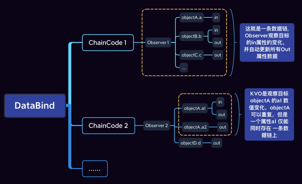- 利用KVO, 数据链就相当于Obverse,每个Observer用一个ChainCode标记,Observer观察每个in数据变化,并更新到所有Out数据